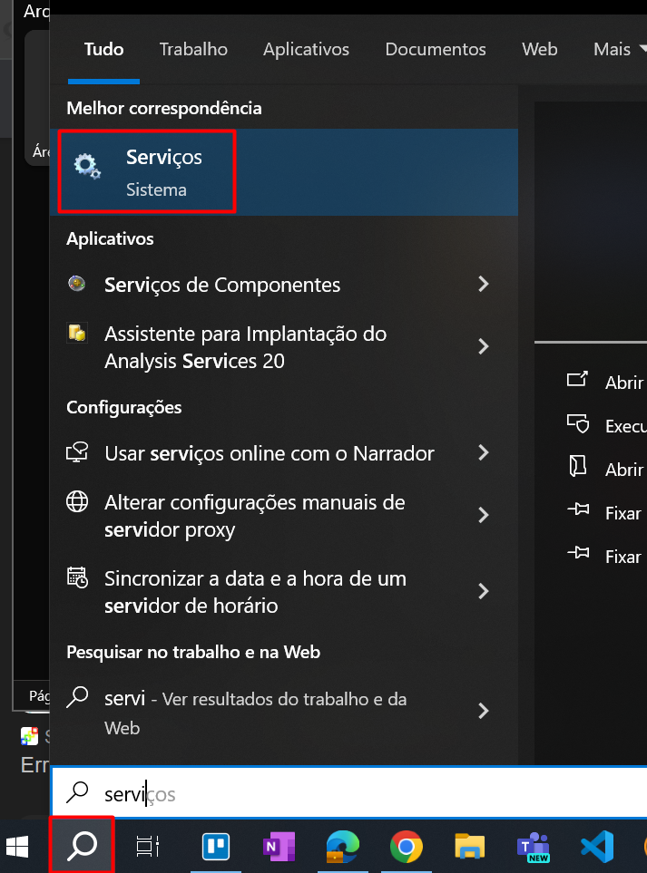 2. Se a impressora estiver ligada e mesmo assim a impressão não sair, procure na barra de pesquisa o programa "Serviços":