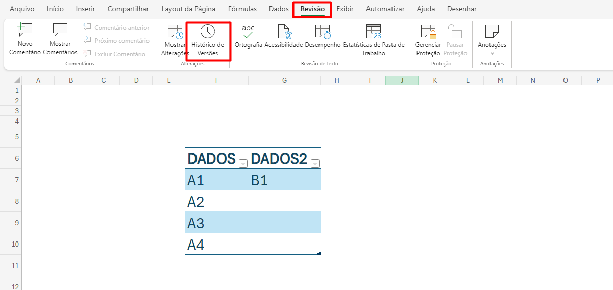 2. No Excel Online, vá na guia "Revisão" e abra o histórico de versões: