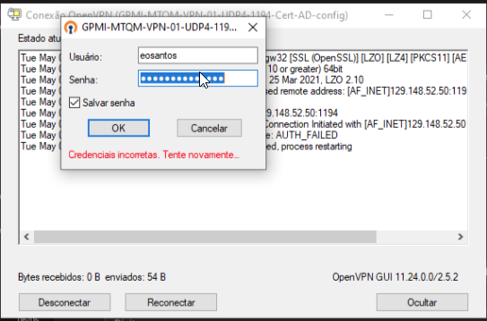 Credenciais incorretas. Tente novamente..