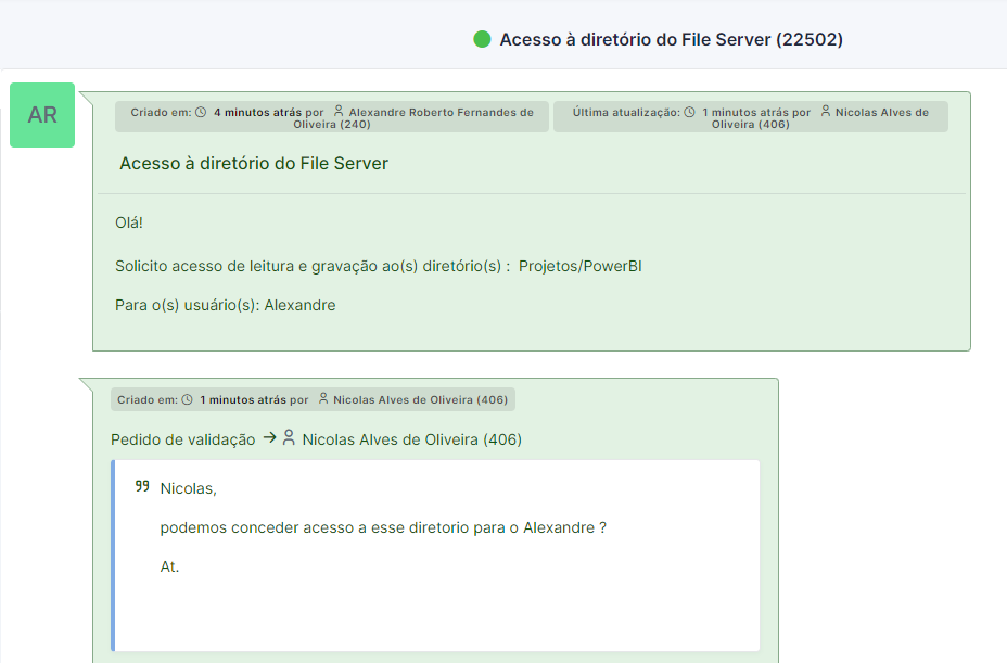 2. Dentro do chamado podemos verificar as interações do chamado e qual o tipo de solicitação estão aguardando sua aprovação: