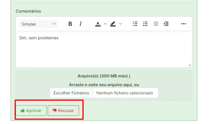 3. Podemos escolher entre “Aprovar” ou “Recusar” e colocar comentários sobre a solicitação: