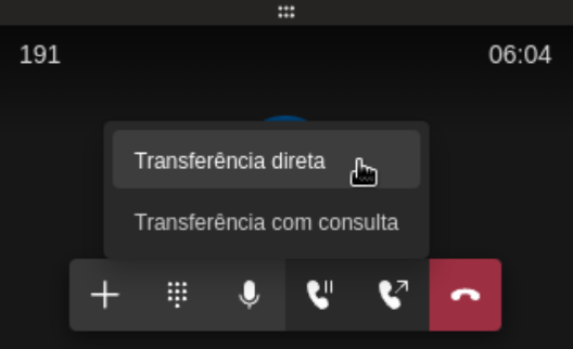 O HIT Phone permite que, em chamadas individuais, a outra parte possa ser transferida. Ao clicar no botão abaixo, um menu é aberto com as duas opções de transferência, direta* e com consulta**