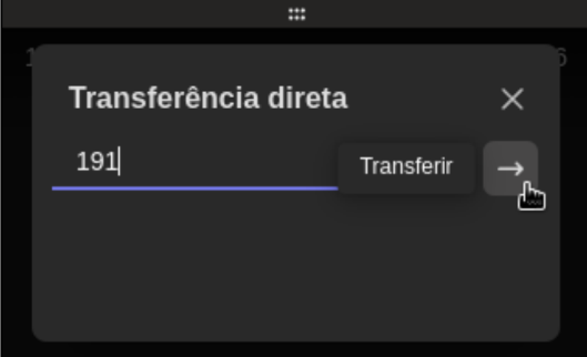 A barra de busca permite filtrar os usuários ativos no sistema e que algum número seja digitado, para o qual se deseja transferir, e então a transferência pode ser confirmada clicando no botão indicado: