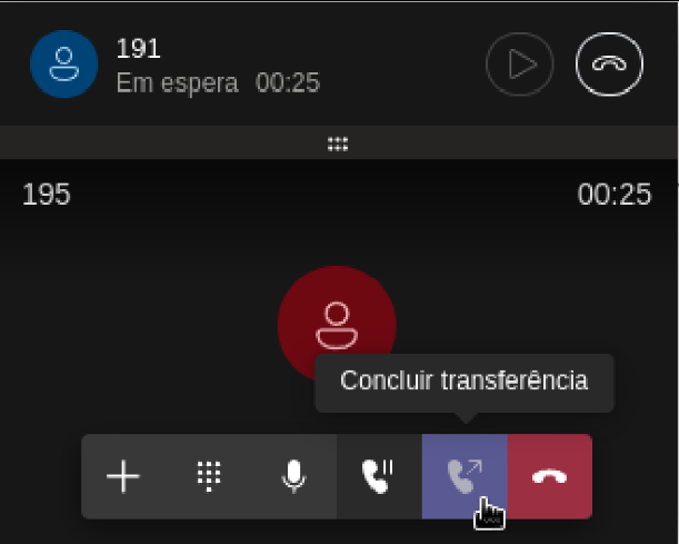 **Transferência com consulta: antes de se realizar a transferência, a chamada a ser transferida é colocada em espera e uma outra chamada é realizada para quem se deseja transferir, e nesse momento se tem a oportunidade de confirmar a intenção e detalhes sobre a transferência, podendo a transferência ser confirmada a qualquer momento, ao clicar no botão em destaque, mostrado abaixo.