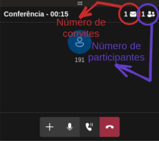 Na barra superior de uma conferência, é possível verificar a quantidade atual de participantes ativos na conferência e a quantidade de convites em andamento.