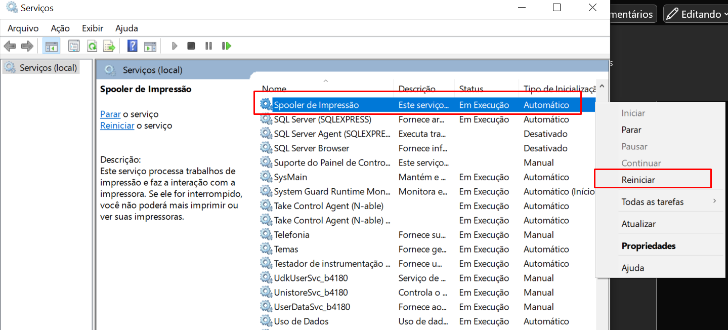 2. Procure pelo serviço "Spooler de Impressão" e clicando com botão esquerdo, selecione a opção "Reiniciar":