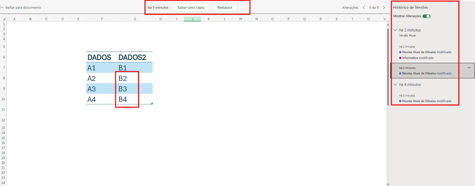 3. Aqui podemos visualizar todas as alterações realizadas na planilha e escolher uma data anterior que os dados estavam salvos e recuperar.