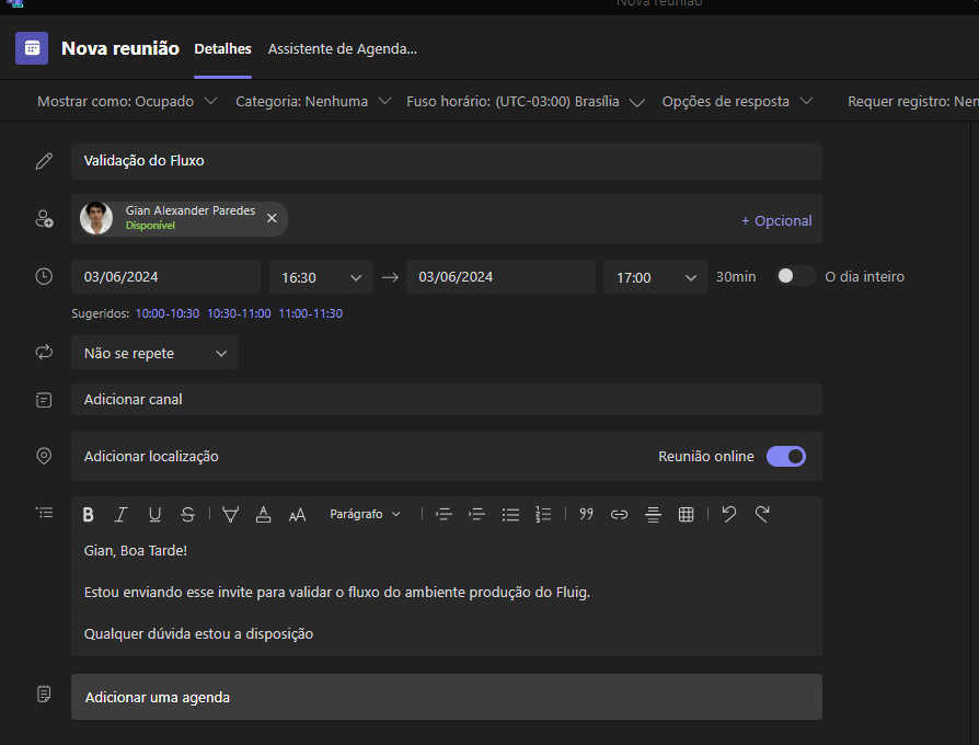 Título: Digite um título para a sua reunião.Local: Você pode definir um local físico, se desejar, ou deixar em branco se for uma reunião virtual.Data e Hora: Escolha a data e a hora para a sua reunião.Duração: Defina a duração estimada da reunião.Participantes: Adicione os participantes da reunião inserindo seus endereços de e-mail ou selecionando-os a partir da sua lista de contatos do Teams.Descrição: Adicione uma descrição opcional para a sua reunião.
