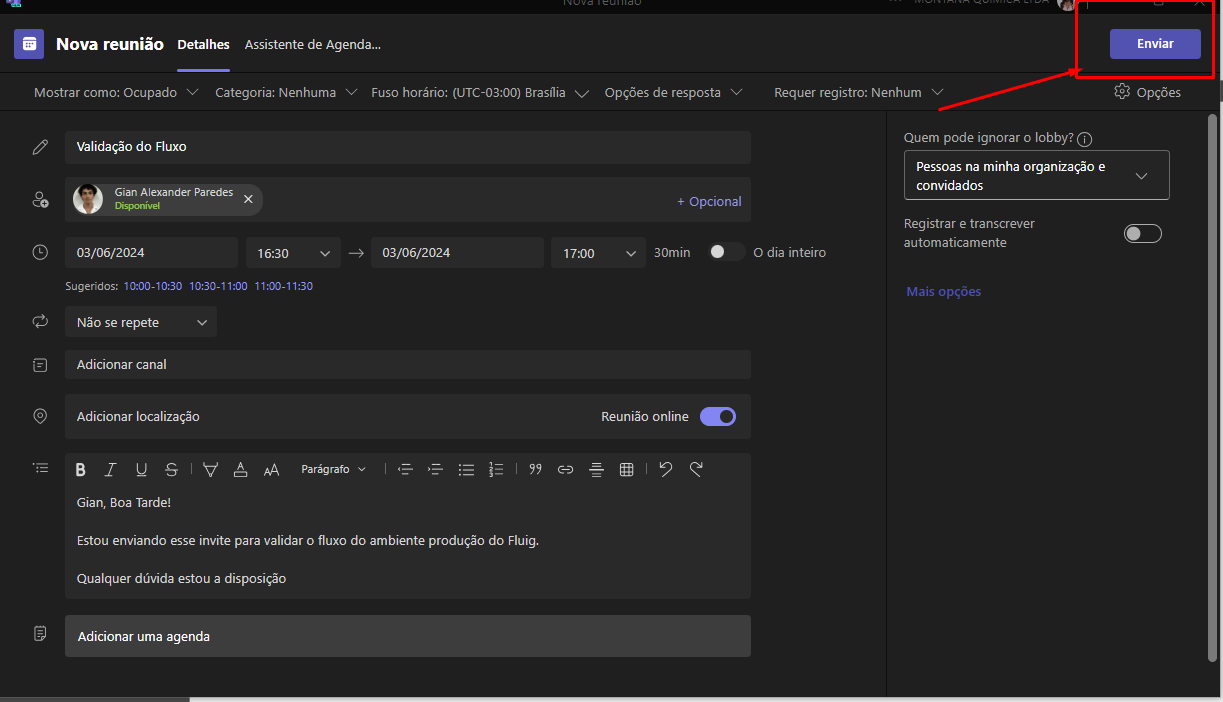 5. Enviar o Convite: Depois de preencher todos os detalhes da sua reunião, clique no botão "Enviar" para enviar os convites para os participantes. Os participantes receberão um convite por e-mail e/ou notificação no Teams, dependendo das configurações de notificação deles.