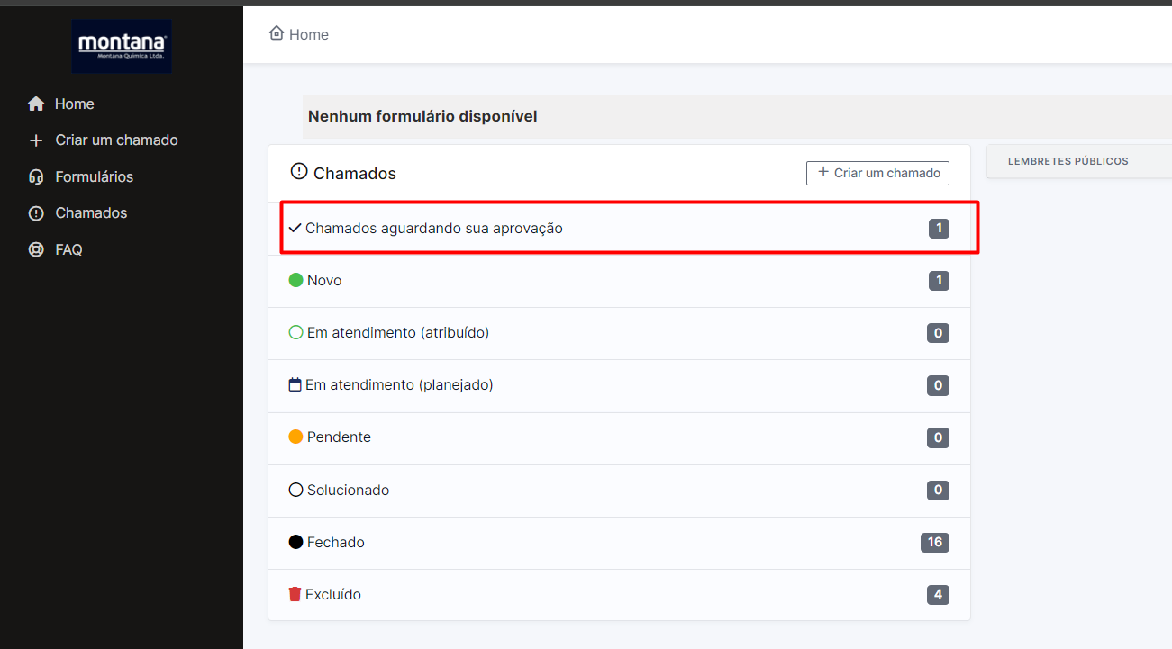 Na página inicial do GLPI, podemos visualizar que nos chamados temos todos os chamados que estão aguardando sua aprovação: