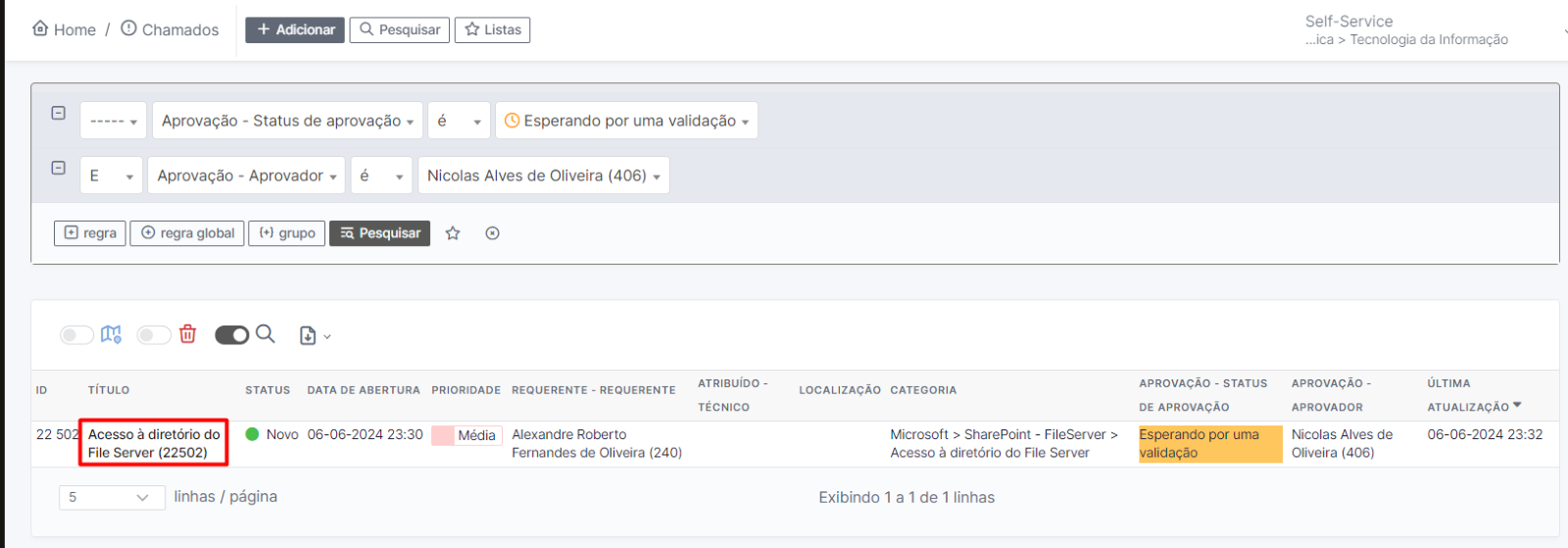1. Podemos visualizar todas as informações de chamados que estão aguardando a validação: