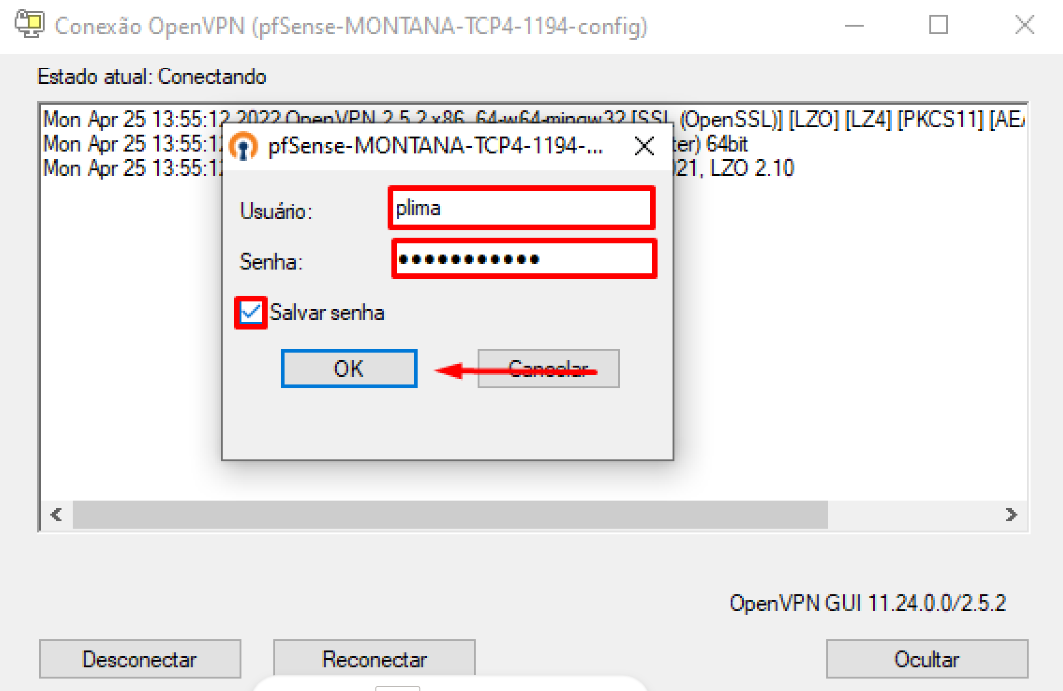 Insira o seu login e senha de rede, salvar a senha é opcional e clique em "Ok"