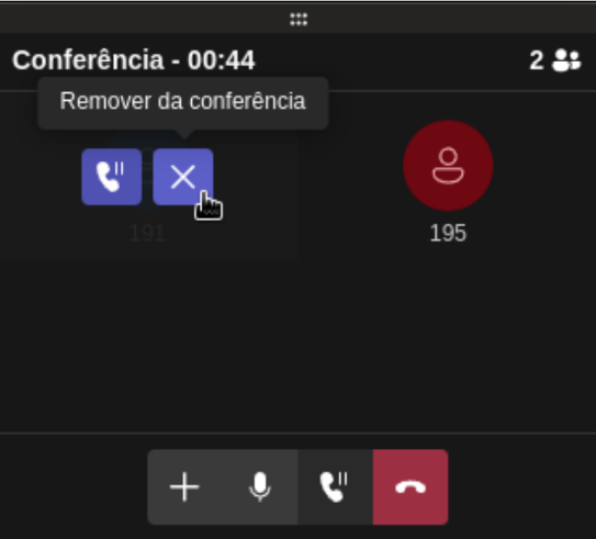 Posicionando o cursor sobre um participante, é possível tomar algumas ações sobre ele de maneira individual, como Remover da conferência e Colocar em espera.